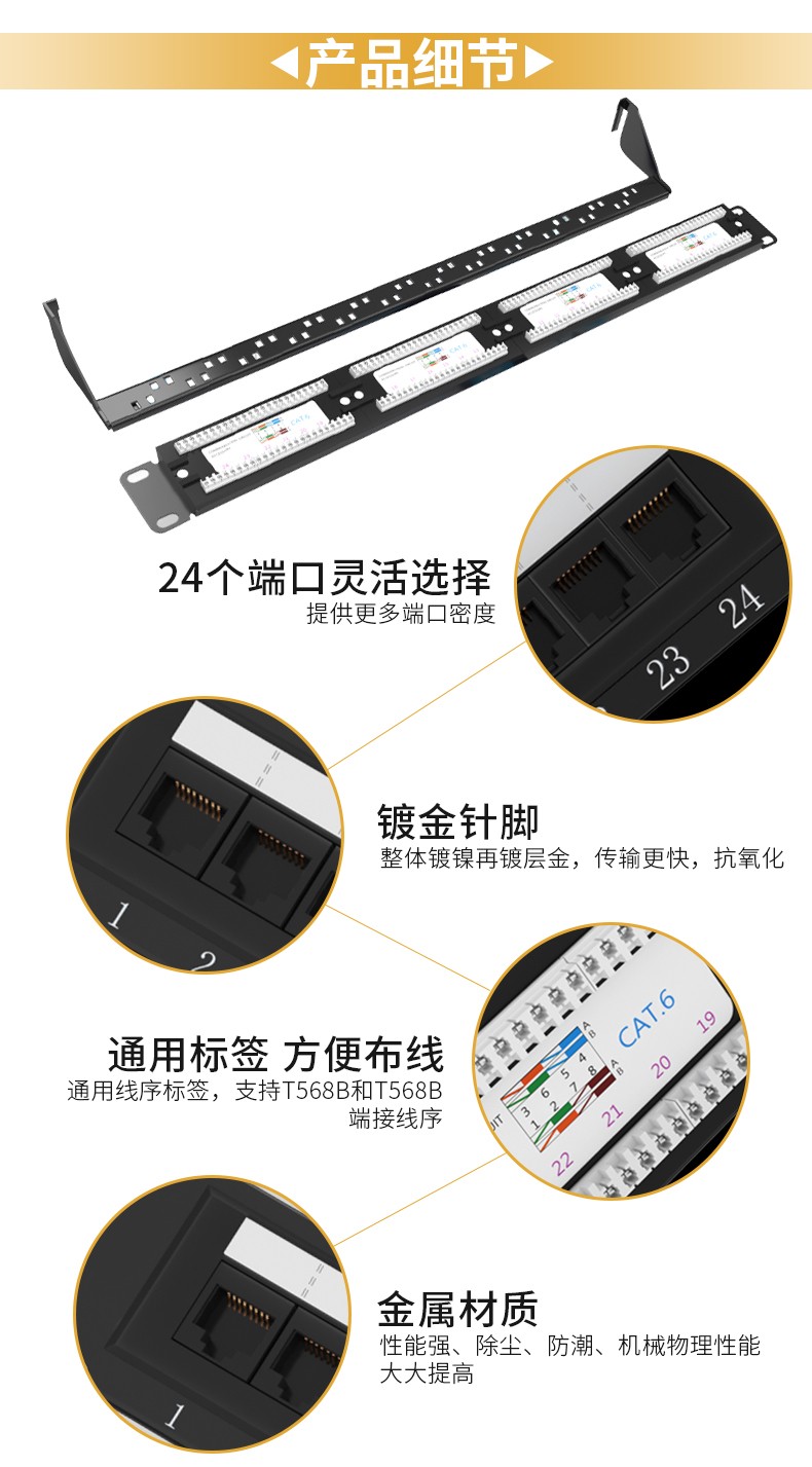 3.標準線序,所有插座都具備T568A和T568B兩種線序,適用所有19英寸標準機柜,后置理線環(huán)