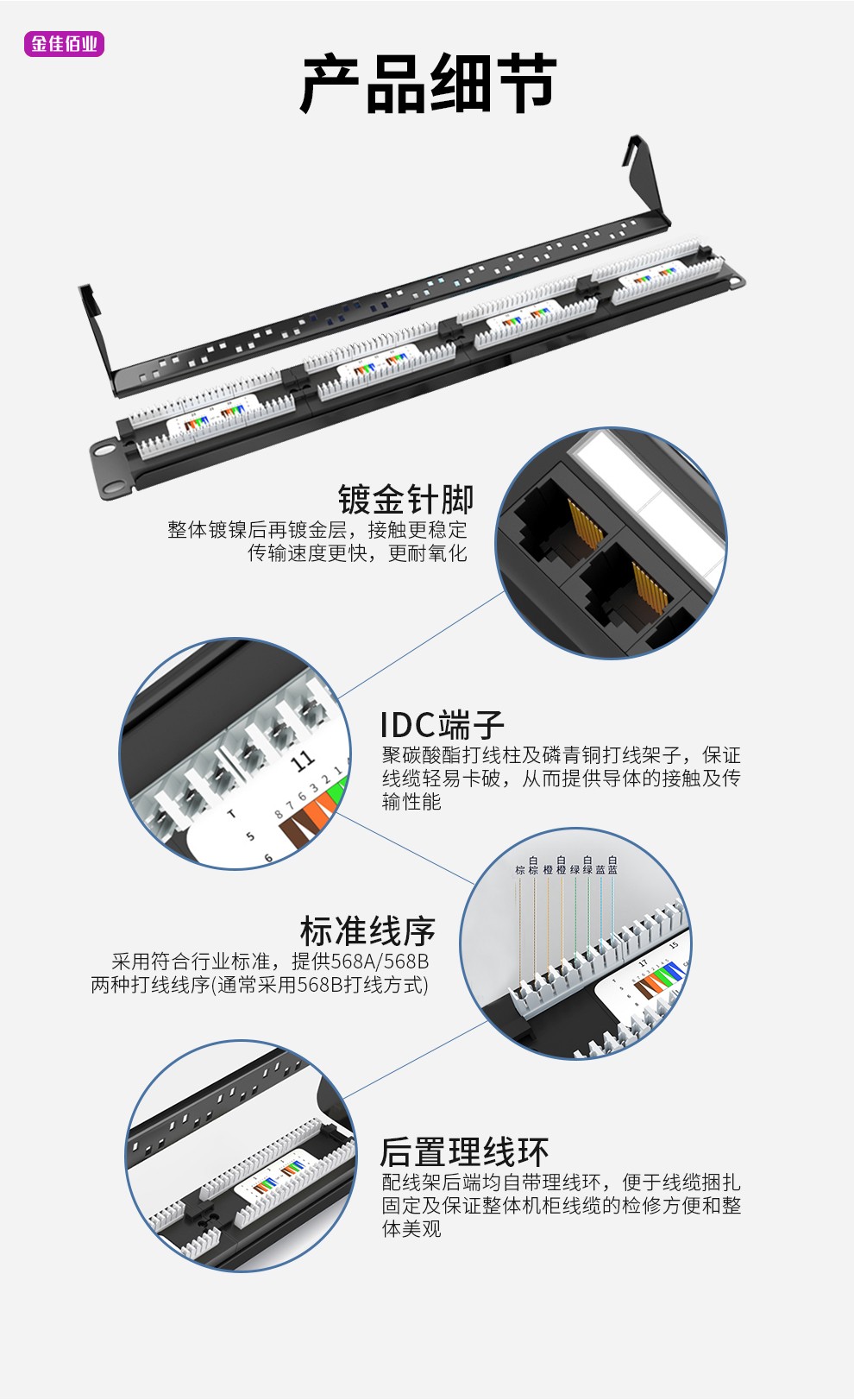 3. 標(biāo)準(zhǔn)線序,所有插座都具備T568A和T568B兩種線序,適用所有19英寸標(biāo)準(zhǔn)機(jī)柜,后置理線環(huán)