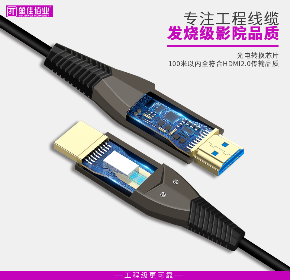 電光火石的光電轉(zhuǎn)換過(guò)程,是HDMI廠家需要攻克的關(guān)鍵點(diǎn)和難點(diǎn)。金佳佰業(yè)光纖HDMI線采用的是光電復(fù)合纜的結(jié)構(gòu),以銅線導(dǎo)電,以光纖傳輸信號(hào)。需要通過(guò)兩次光電轉(zhuǎn)換才能實(shí)現(xiàn)信號(hào)傳輸,一次是電信號(hào)轉(zhuǎn)成光信號(hào),然后光信號(hào)在光纖線內(nèi)傳輸,然后再有光信號(hào)轉(zhuǎn)為電信號(hào),實(shí)現(xiàn)信號(hào)由SOURCE端到DISPLAY端的有效傳輸。