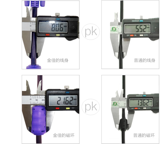 金佳佰業(yè)VGA線線身粗達8mm,而市場上的普通VGA線身僅5mm;金佳佰業(yè)VGA線磁環(huán)直徑達21.6mm,市面上的普通VGA線材磁環(huán)直徑僅有13mm,有料看得見。