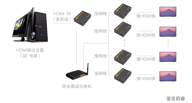 金佳佰業(yè)網線延長器打破距離限制,采用單條CAT5E/6類網線連接,真正實現(xiàn)單網線延長120米,畫面無損傳輸,在使用上給您帶來更多便捷與靈活性。金佳佰業(yè)延長器采用HDMI網絡分配技術,借助網絡分配產品(路由器,交換器),可以實現(xiàn)一臺發(fā)射端連接多臺接收端使用,實現(xiàn)多屏同時展示。