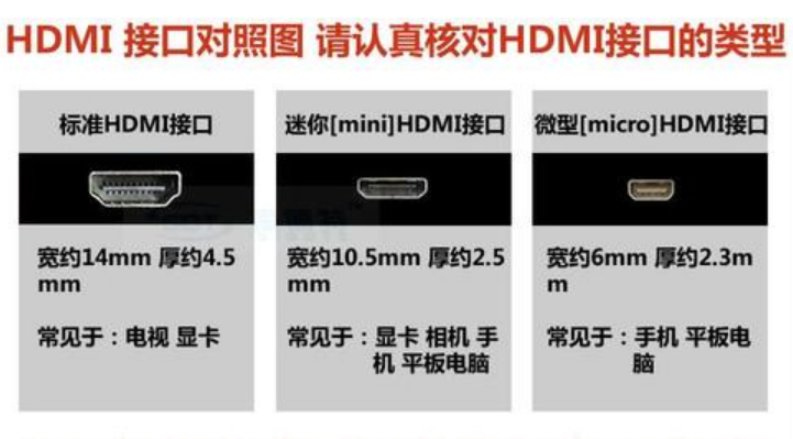 購(gòu)買HDMI線之前,確認(rèn)好電視或投影儀或者顯示終端的HDMI接口尺寸。目前HDMI接口尺寸分為標(biāo)準(zhǔn)HDMI接口、Mini HDMI接口以及micro HDM接口,三種不同尺寸,選擇時(shí)留意下,免得買錯(cuò)了花冤枉錢