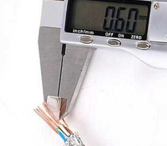 這個(gè)方法相對(duì)上面的來說比較專業(yè),需要有游標(biāo)卡尺來完成測(cè)量。五類線徑:0.30mm—0.45mm,超五類線徑:0.48mm—0.51mm,六類線徑:0.55mm—0.58mm(中間有十字骨架),七類線徑:0.59mm—0.6mm。