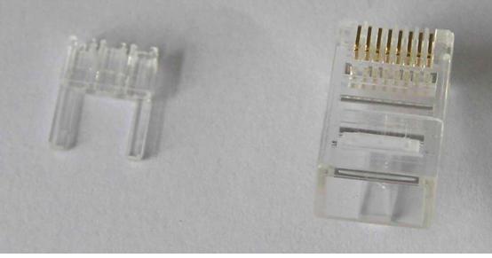 六類網(wǎng)線需要用到六類水晶頭,而六類水晶頭和傳統(tǒng)的五類水晶頭不同,六類水晶頭分為內(nèi)部和外殼,首先我們要將他拆分,如下圖。